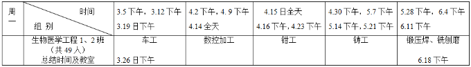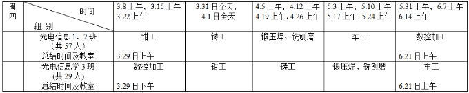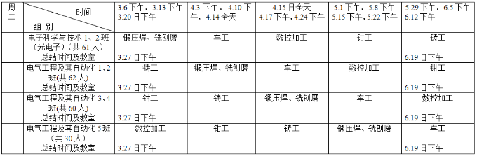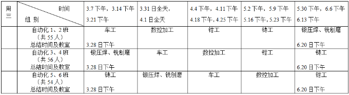 非机类(2周):学生(9个班)按照实习内容分为5组、每工种实习时间累计2天。