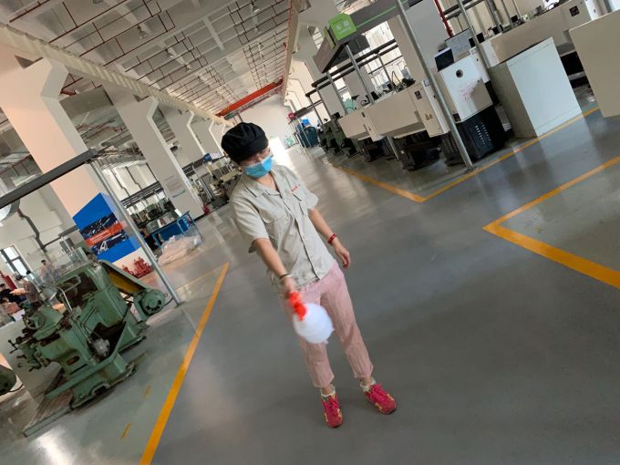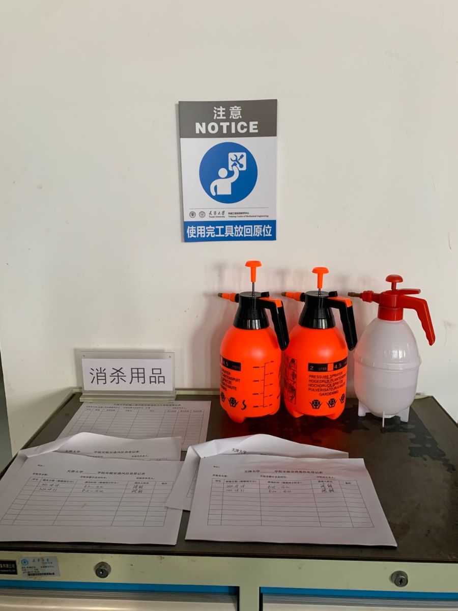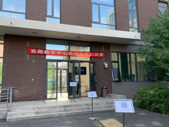 时间回到两周前的清晨,老校区大活旁四辆金色的大巴车载着同学们,来到了新校区35号楼的实践教学中心。此时的车间里早已有教师们开展防疫工作的身影,拿着喷壶行走在休息区、教室、机房等地,一如既往地进行环境消杀。车间和教室的拐角处摆放着供同学们使用的防疫物资,间隔一米的黄色提醒标志提示同学们保持安全距离……全体教职工以点滴行动守护着、迎接着首批返校上课的学生们。