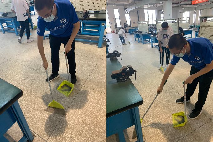 下午实习到了尾声,同学们拿起扫把、拖把仔细清扫工作地。散落地面上的铁屑、油污在同学们的“围歼”下恢复如初,同学们体验着劳动的喜悦。