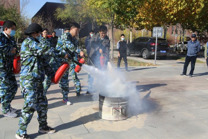接下来进入灭火器操作使用环节,应急演练随之进入了高潮。弓科长亲自示范了过滤式防毒面具的佩戴和使用要点,二氧化碳灭火器的正确使用方法,同学们仔细观察,记住每个关键的操作要领,面对燃烧的大火,同学们的表现十分沉着,按照操作规范对准火桶的火苗根部进行灭火演练,汽油引燃的浓烟大火迅速地被扑灭。