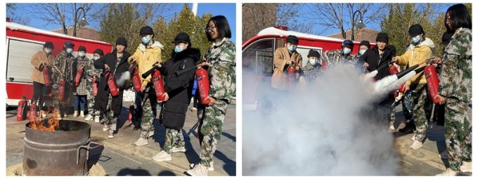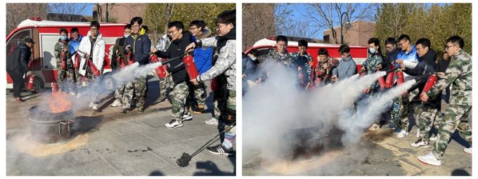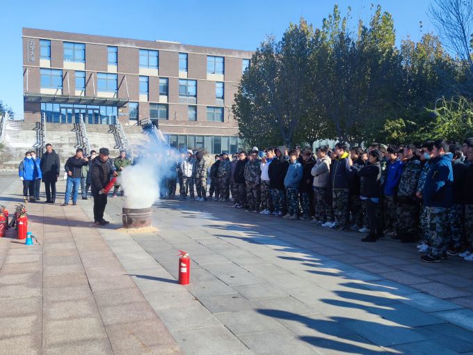 在灭火器操作使用环节,弓保津科长先是详细讲解了灭火器的种类、使用途径和方法,并亲自示范了二氧化碳灭火器的正确使用方法,同学们仔细观察,记住关键的操作要领,实操环节,同学们面对燃烧的大火,表现十分沉着,按照操作规范,对准火桶的火苗根部进行扫射灭火演练,引燃的浓烟大火被迅速地扑灭。