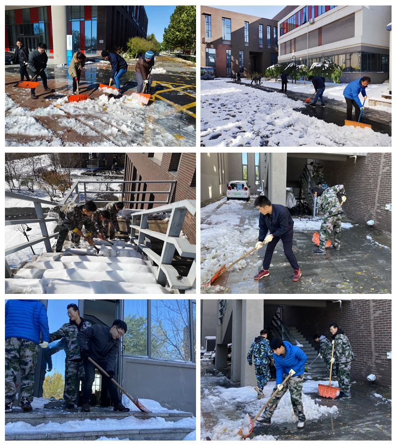 演练前两天带来一个小插曲,立冬时节我市迎来一场罕见的大风雪、降温天气,一夜之间演习场地和楼宇周围覆盖一层厚厚的积雪和冰,给撤离的师生带来重大安全隐患,中心党支部号召正在实习的师生党员利用中午休息时间进行清雪除冰。