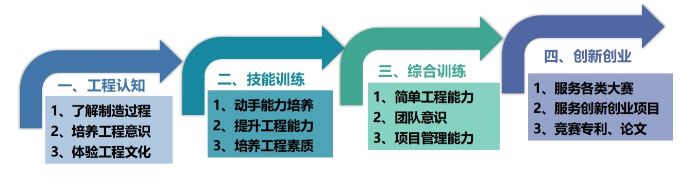二、设计不同层次课程,充分考虑到不同专业、不同层次、不同类型学生培养目标的不同,搭建了工程认识、技能培训、综合训练、创新创业四个层析递进式培养方案(如图2),在此平台上引入先进制造装备的内容,提升和改进教学内容。目前中心传统的教学模快已从60%压减到40%。