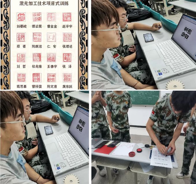 激光加工训练模块是新添加的教学内容。该项目使用的机床可在多种材料上实现复杂形状的高精度加工,同一设备多工序集成性强,且作品展现力较为丰富。激光加工可以在非金属材料上进行,重在呈现激光加工独特加工能力,学生运用LaserMaker软件进行图像预处理,驱动激光设备实现印文及边款的整体雕刻,后经钻孔、抛光与钤印测试等工序,形成完整的产品制作闭环,在小小印章的方寸之间尽显高校工程教育与文化传承的深度融合实践。